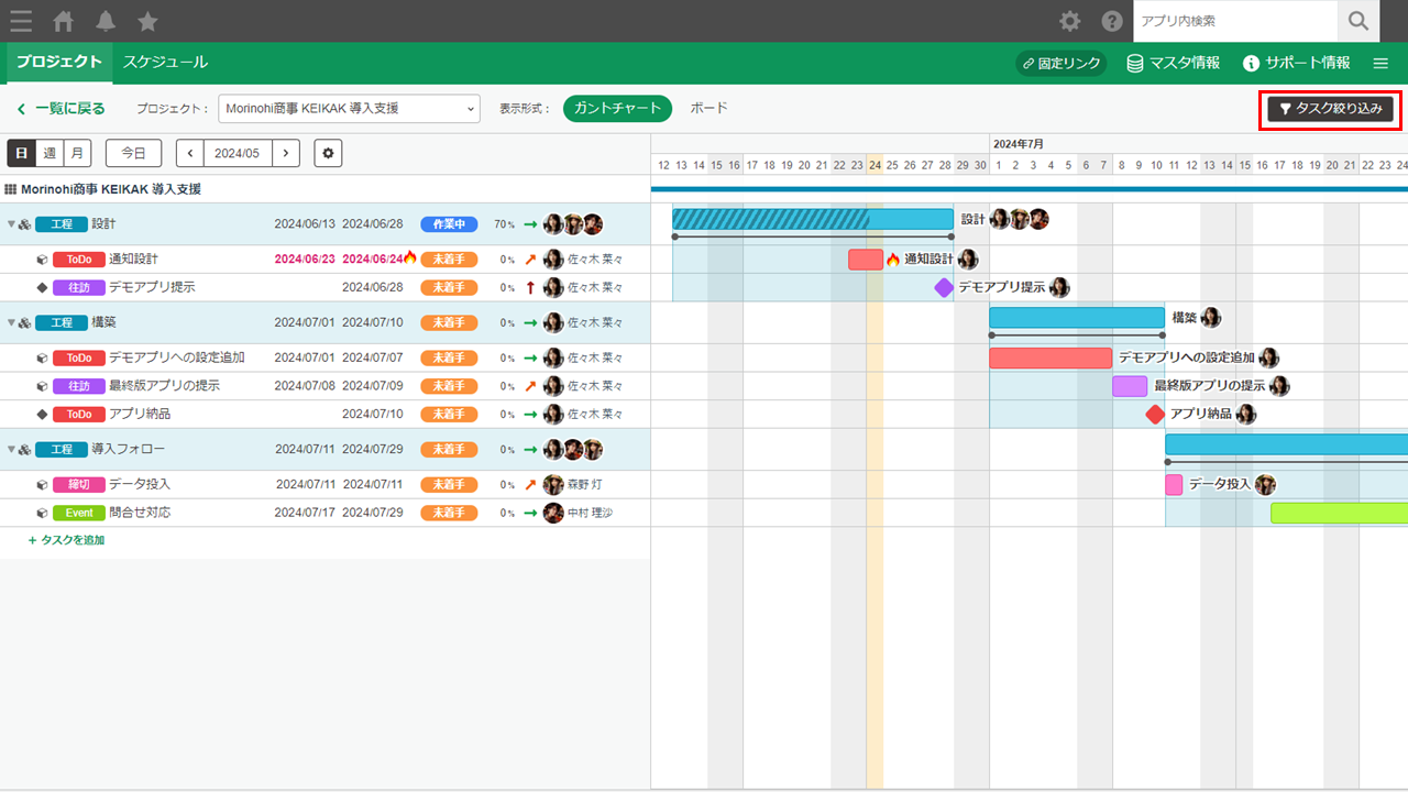ガントチャート画面に戻り、条件を満たすタスクが表示されます。 絞り込み条件が適用されている場合、右上のタスク絞り込みボタンは黒色で表示されます。