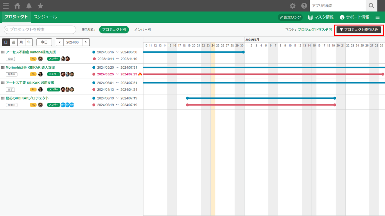 絞り込み条件が適用されている場合、右上のプロジェクト絞り込みボタンは黒色で表示されます。