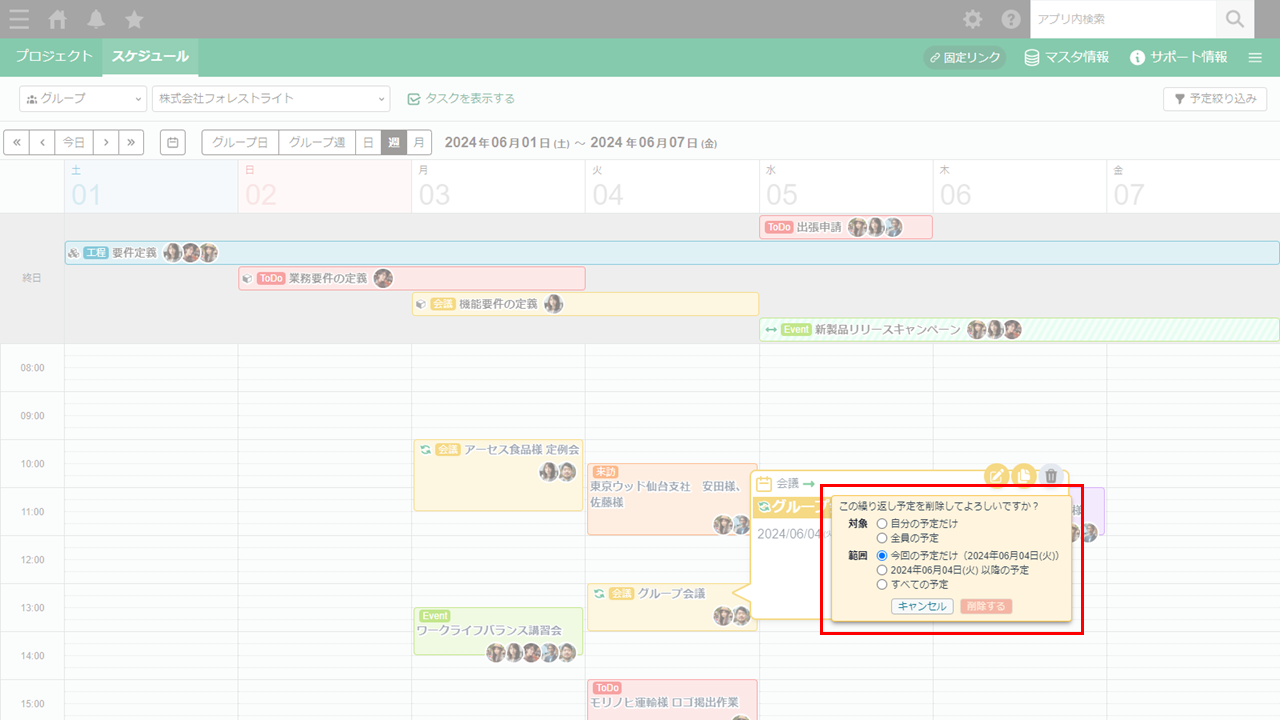 「全員の予定」を選択すると、予定のレコード自体が削除されます。